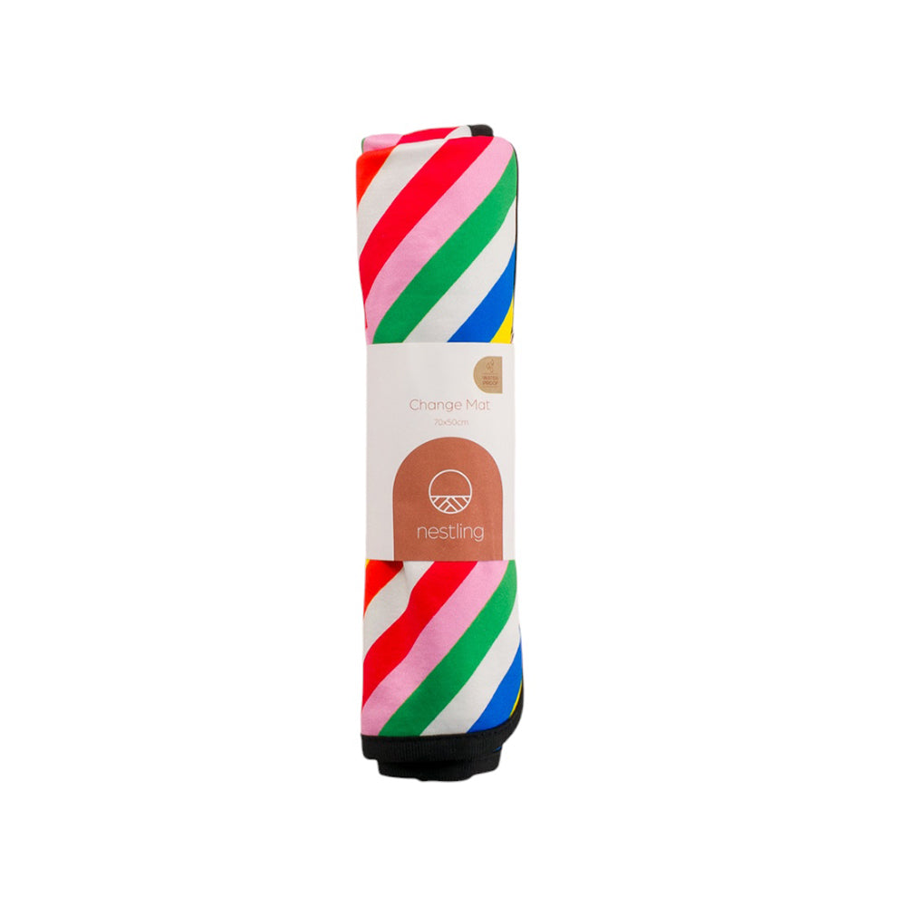 There is a band with a snap that wraps around once rolled up to keep in place. Nice and compact so it doesn't take up too much room in your nappy bag.